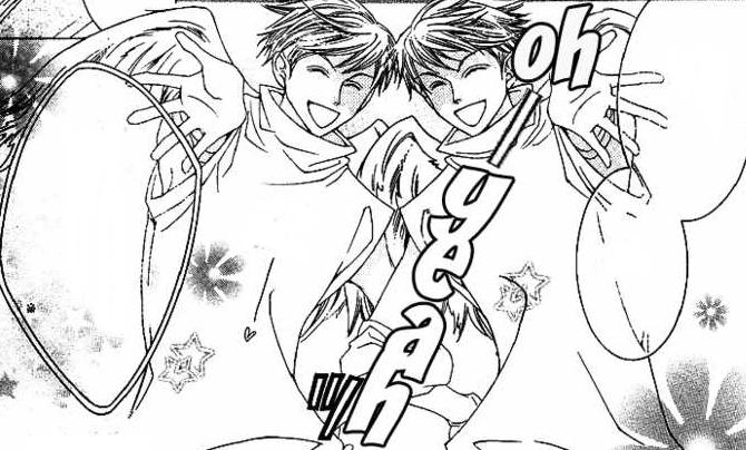 The twins, however, actually look bored and an infuriated Tamaki demands that they apologize to Haruhi. They finally do so, embarrassed. Haruhi also recognizes her own attitude and invites them to go to the Costume Ball with her. And with that, they leave Music Room 3 and attend the event.