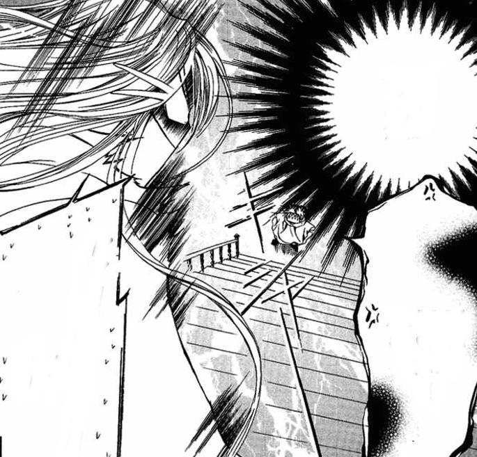 Through a nearby window, she spies the girl with the long hair still standing on the top floor of the Central Hall, now grinning at her. When she announces this, Kimiko and Momoka whisper together. Hikaru says he can’t see anything, then asks Class President Kazukiyo Soga if he sees anything. Haruhi doesn't understand, but then the window cracks and Kimiko and Momoka scream that Haruhi is cursed.