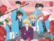 In the salon, the Hosts are cosplaying in late Edo era samurai costumes. Haruhi expresses her surprise that it's so popular, with the twins informing her that it's a cosplay basic and Honey adding that the girls who love it are simply crazy about it. Renge Houshakuji unravels a mini-history lesson about the Ikedaya Inn and the noble shinsegumi, thrilling herself with her narrative. Kyoya Ootori compliments Renge on her suggestion that the guests be allowed to project identities onto the hosts instead of giving them specific roles, their friendly exchange indicative of a normalized relationship.