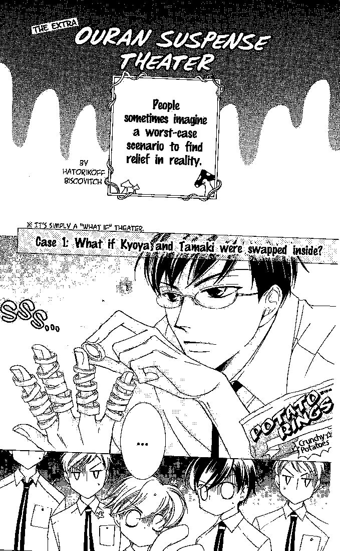 | 16.1 | Ouran Suspense Theater is an extra chapter that explores the questions: What if Kyoya Ootori and Tamaki were to swap bodies? And what if Honey gains weight because of cakes and sweets? | |